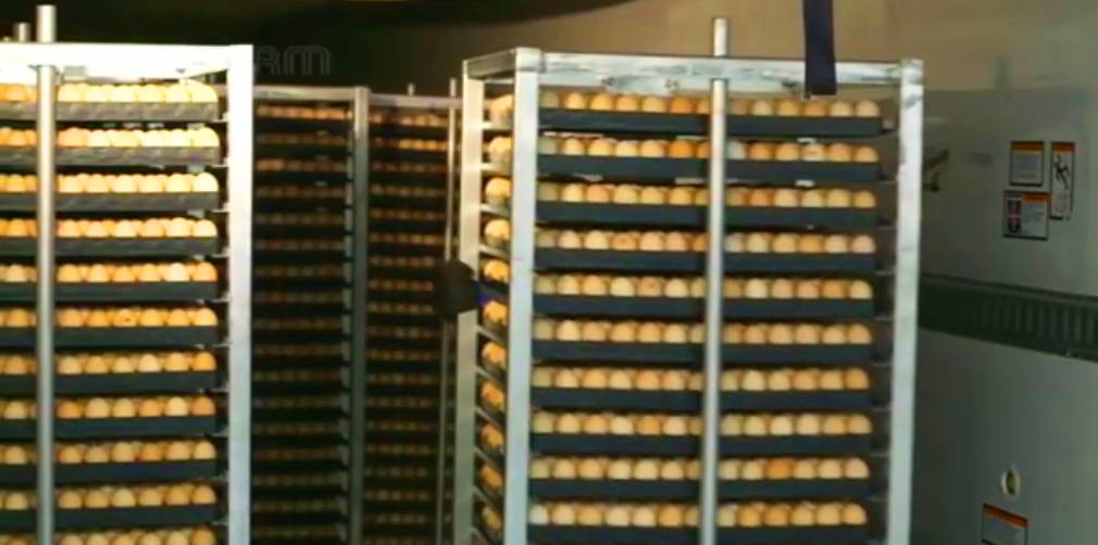 - The eggs are stored in racks and incubated for 18 to 20 days to produce chicks.